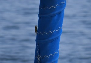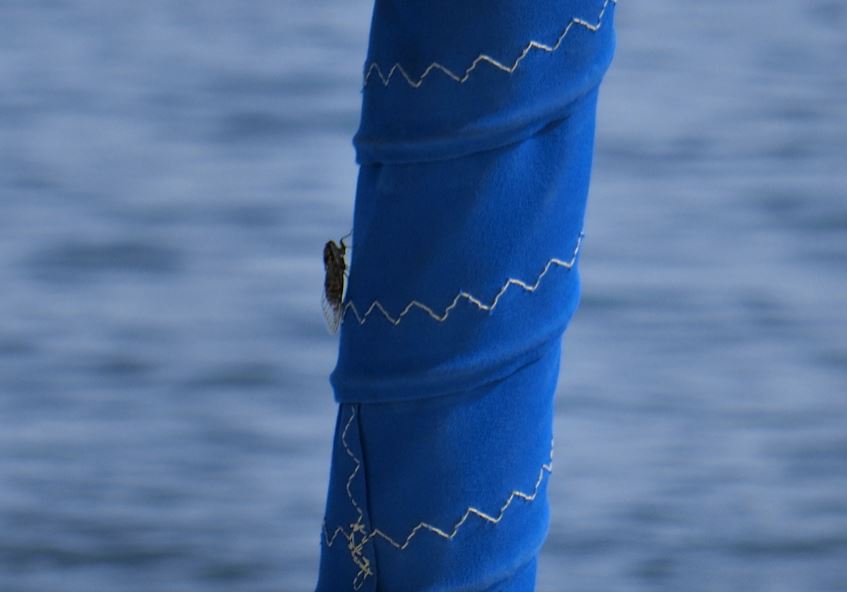 Da müssen Zirkaden wieder einmal auf unserem Schiff sitzen. So laut ist ihr Geräusch. die erste hab ich gleich gefunden. Sie sitzt am aufgerollten Segel, die andere ist noch viel lauter, aber ich find sie nicht mit dem Fernglas, nur hören kann ich sie. Find ich nett, dass sie uns wecken und besuchen.