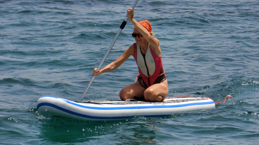 11.30 Normalerweise wird um 12.00 der Wind stärker. d.h. das Standup Board ins Wasser und lospaddeln. Es hat 9 Knoten Wind. Wie immer sitzend und kniend gegen den Wind und stehend wieder zurück.