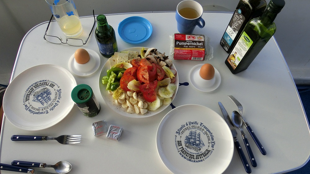 3x ums Boot herum, bisschen Yoga, Kurt aufwecken, Frühstück.