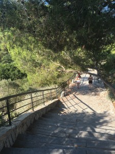 Wir laufen entlang, dann Stiegen runter zum Meer, Stiegen wieder rauf auf der anderen Seite, weiter an den Villen entlang.
