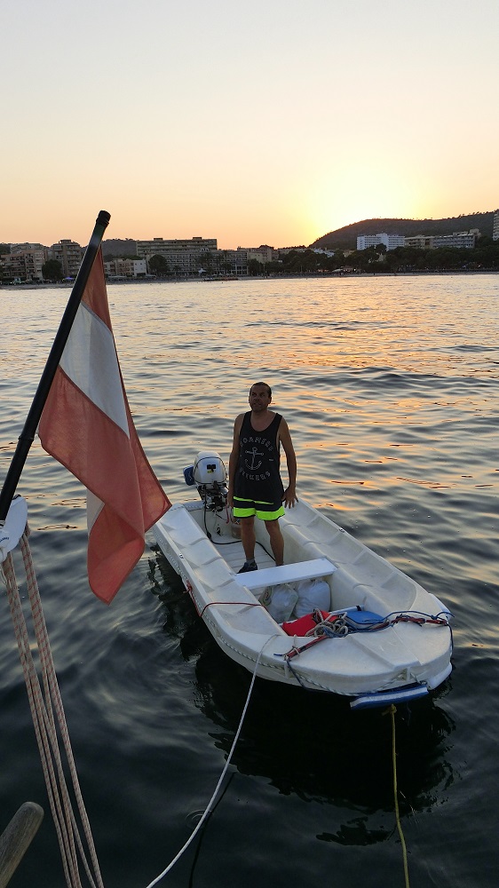 Wir kontrollieren noch unsere Ankerkette und den Abstand zu den anderen Booten und fahren mit dem Beiboot in den Ort. Kurt ist wieder einmal fertig, während wir noch überlegen, was wir anziehen. Aber das ist eben so, wenn er sich 3 Mädels mitnimmt.