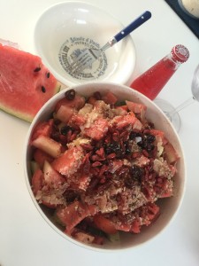 Am Abend gibt es einen Wassermelone, Schafskäse Salat von Daniela zubereitet und mein frisch gebackenes Brot mit Humus.
