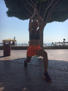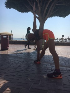 Kurt, Valeria und ich laufen 5km in recht flottem Thempo, Daniela läuft weiter ihre 10km.  Nach dem Laufen gibt es wieder 30 Minuten Yoga unter einer Palme im Schatten. Kurt will nicht mitmachen, so darf er uns fotografieren.