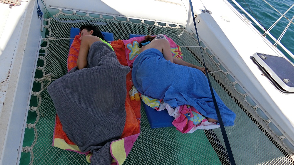 Ich hab in der Zwischenzeit frisches Obst gekauft. Zurück am Schiff bereitet uns Daniela vegetarische Eiweiß Pancake und wir essen viel Obst dazu. 2 Stück sind so sättigend, dass die Mädels und Kurt schlafen gehen danach im Schatten. Aber sie waren sehr lecker!