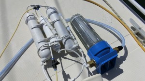 Unser Osmose Anlage bereitet ununterbrochen gutes Trinkwasser für uns aus dem Hafenwasser, das sehr kalkreich ist und nicht so gut schmeckt.