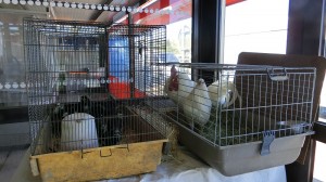 Im Supermarkt verkaufen sie kleine lebend Hühner, einen großen Hahn und eine Henne. Daneben langfedrige Hühner, sehen aus wie langhaarige Meerschweinchen.