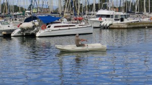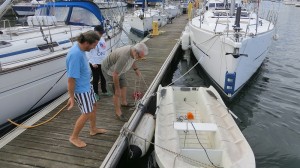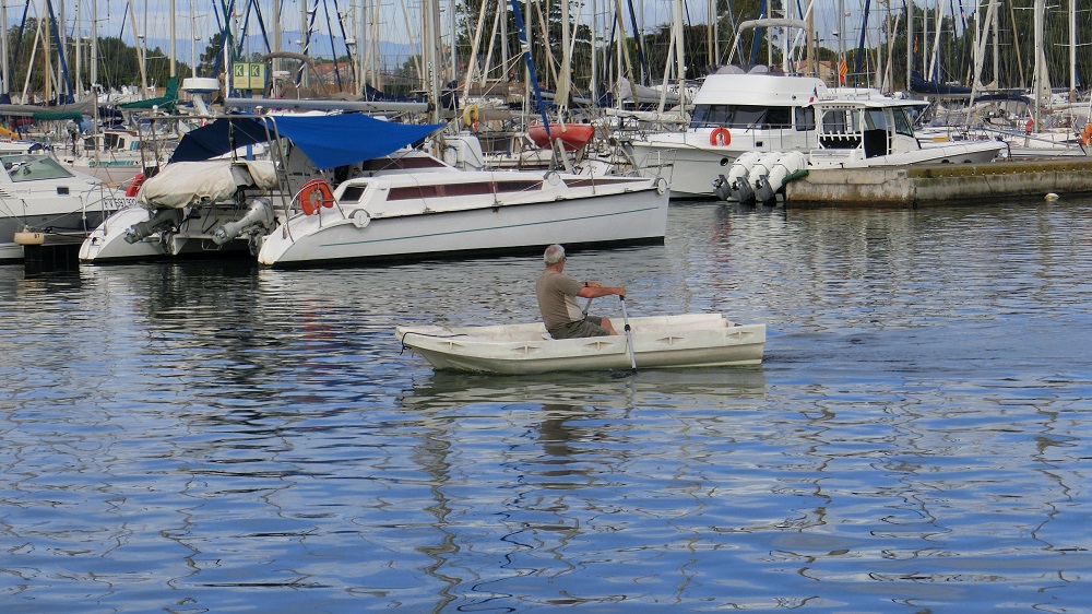 10.00 Pierre holt sich unser altes Tender und rudert es zum Hafen.