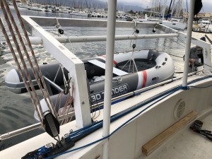 Das Beiboot hat eine Halterung bekommen und eine Winde, damit wir es ohne Anstrengung hoch ziehen können. Sehr gut!