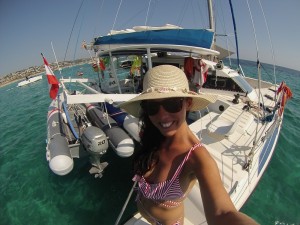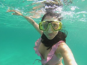 Daniela weiß gar nicht was sie zuerst machen soll, paddeln, schwimmen, mit der GoPro unter Wasser Fotos machen.