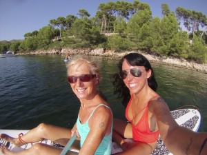 Daniela und ich steigen aufs Standup Board mit der GoPro in der Hand und paddeln die Bucht ab.