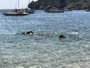 Wir beobachten ein eingespieltes Team, Hund und Herrl beim täglichen Schwimmtraining.