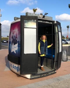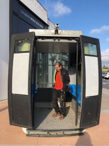 Vor der Türe steht für Werbezwecke eine Skifahrer Gondel. Lang, lang ists her, dass wir mit so etwas gefahren sind.
