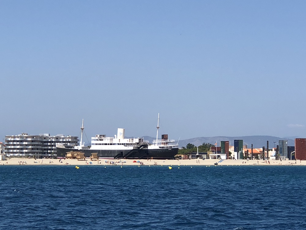 Mitten am Strand steht ein wunderschöner riesiger Dampfer, vielleicht wird es mal ein Lokal oder ähnliches.