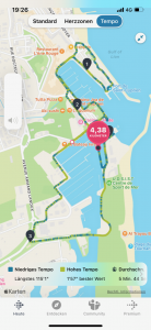 19.00 Der Wind ist jetzt sanft, d.h. auf auf unsere Roller. Wir fahren natürlich mit Beleuchtung eine Hafenrunde. Es geht jeden Tag besser und wir sind schon recht flott. Es ist wirklich das totale Fitness Gerät, weil der ganze Körper im Einsatz ist.