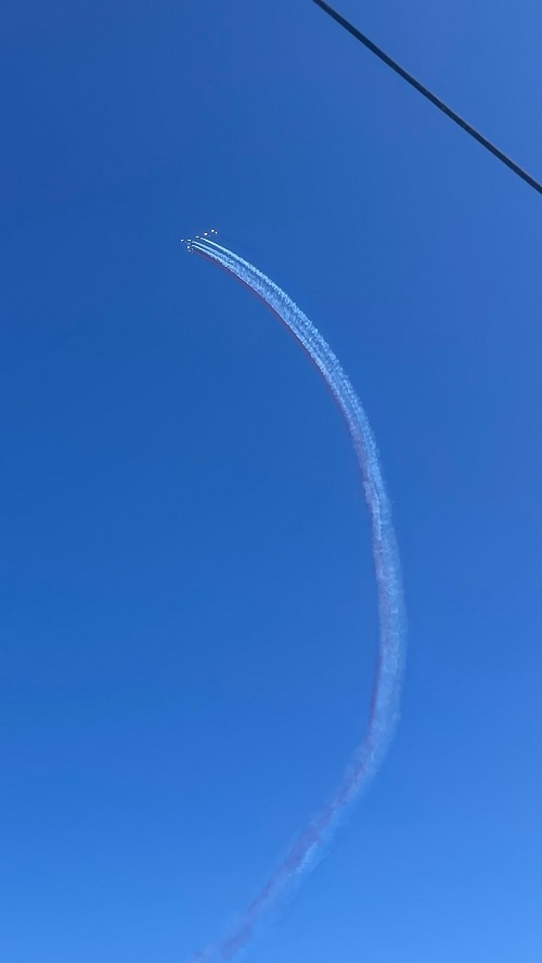 15.00 wir wollen gerade essen, als plötzlich eine Flugshow beginnt mit 9 Flugzeugen. Wirklich bemerkenswert wie sie sich einreihen, Platz tauschen, Farbe ausspeien und sich wieder sortieren und dies alles bei hoher Geschwindigkeit.