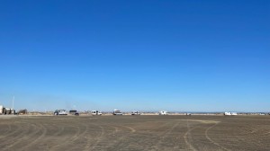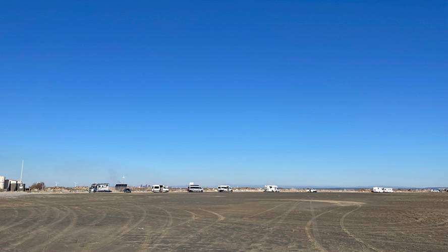 Viele Wohnmobile stehen dort, fast wie im Sommer.