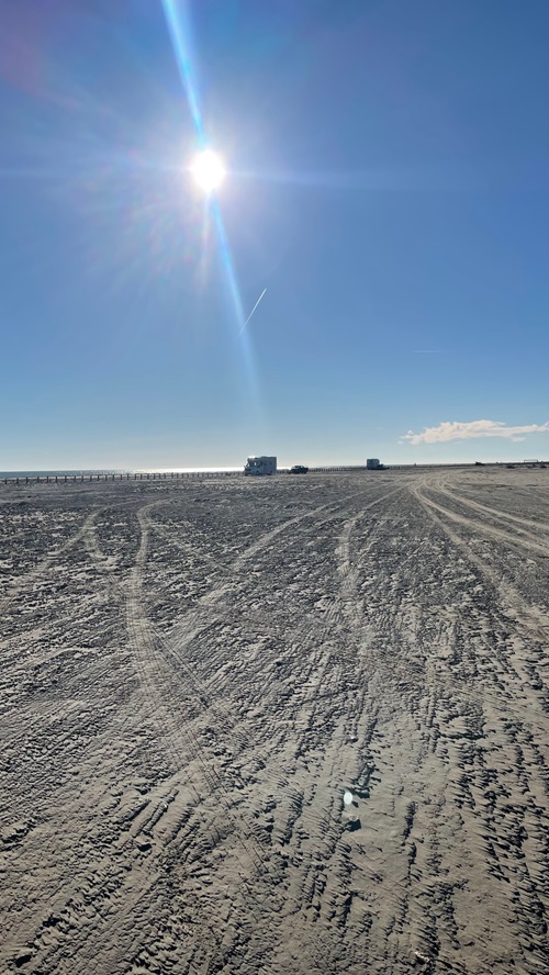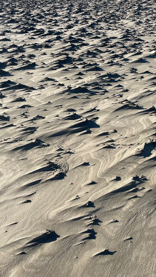Es ist einfach genial, am Strand zu schlafen unter Sternenhimmel und Morgens Türe auf und raus auf den Strand. Die Weite dieses Strandes ist so imposant und überwältigend. Dieses Muster im Sand sieht aus wie ein Kunstwerk. Wind und Wellen haben es erzeugt.