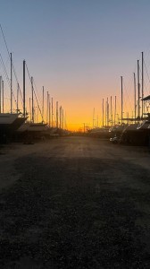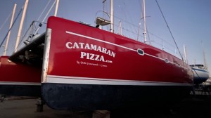 Bei meiner abendlichen Hafenrunde um Sonnenuntergänge zu suchen, hab ich einen roten Katamaran entdeckt. Catamaran Pizza.com