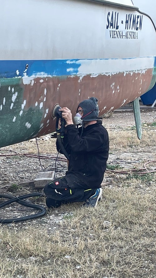 Kurt schleift, dazwischen versuche ich mich auch ein bisschen aber man braucht viel Kraft um ordentlich anzudrücken, sonst kann die Maschine nichts abtragen. Das grün vom Copper Coat verschwindet und ein brauner Rumpf bleibt übrig. Darauf sieht man dann wieder ob Osmose Stellen vorhanden sind, oder kleine Bläschen, die durch das Auftragen vor 12 Jahren entstanden sind.