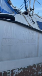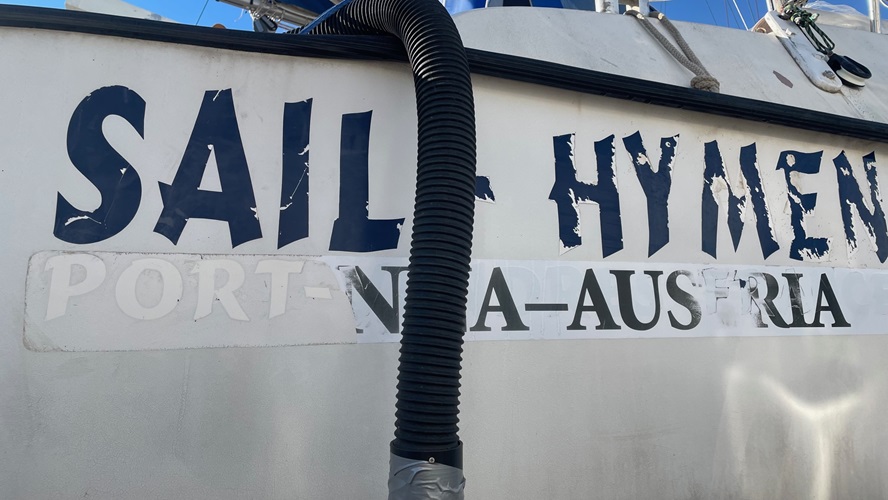 Wir starten die 3. Standheizung, montieren einen Schlauch und ich darf mit Spachtel und dem heißen Schlauch versuchen, unsere Schriftzüge – Sail-Hymen / Vienna zu entfernen.