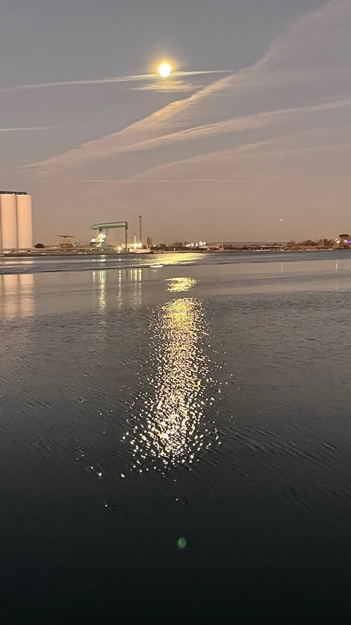Wir machen noch eine Runde durch den Hafen. Der beinahe Vollmond ist wunderschön.
