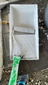 Wir opfern meinen kleinen 5l Kübel und mischen dort Härter und Lack zusammen, rühren alles gut durch und schon wird mir ein Kissen mit Farbe zugewiesen und eine Walze.