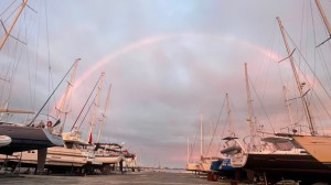 Er überspannt den ganzen Hafen. Während auf der anderen Seite die leuchtend roten Mistral Wolken als Vorboten sichtbar sind.