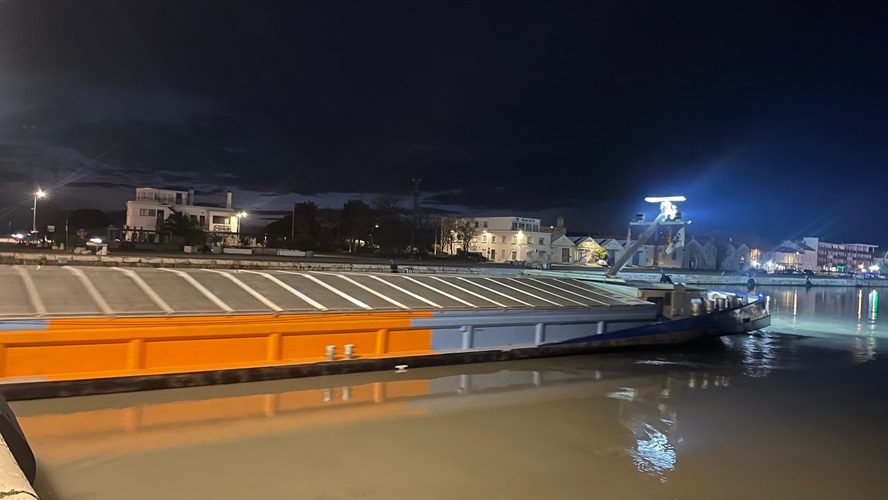 Bei der Schleuse steht der lange Fluss Schlepper Odin. Wir sehen ihn jede Woche. Die Schleuse öffnet und die Brücke sperrt sich für Autofahrer und Fußgänger.