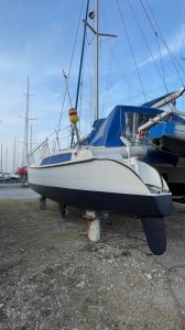 Die linke Seite, der linke Rumpf hat erst einen Anstrich Antifouling. d.h. trocken wischen und es geht schon los für mich.
