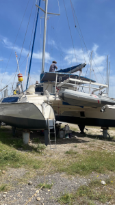 Kurt beginnt mal oben zu kärchern bei den Solaranlagen und dem großen Segelsack. Danach kommt mein Cockpit dran.