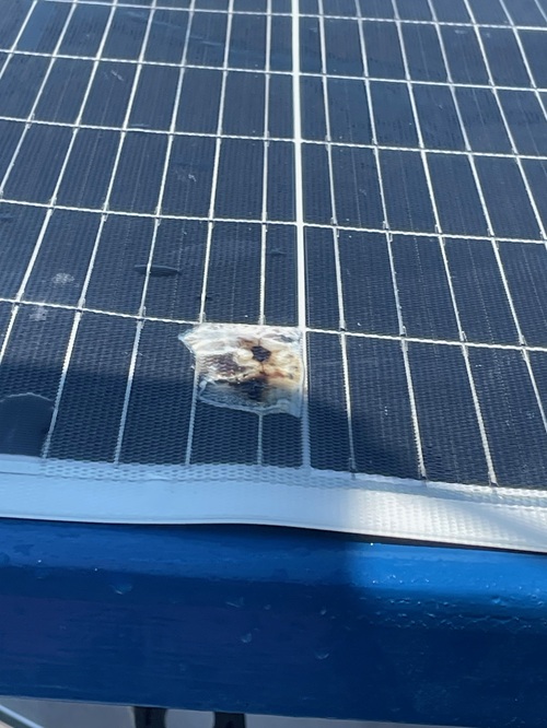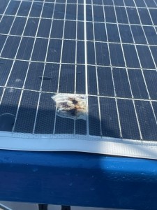 wir gehen wieder ins Cockpit. wieder dieser seltsame Geruch. Genua ist jetzt aber schon weit weg. Schließlich finden wir es. Ein Stückchen der neuen Solarplatte ca 5x5cm ist durch geschmort und knapp davor Feuer zu fangen. Feuerlöscher? Wasserschlauch?