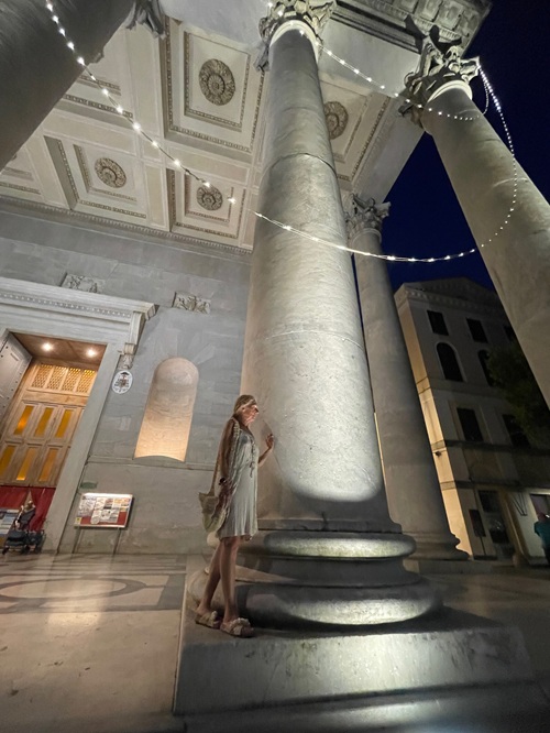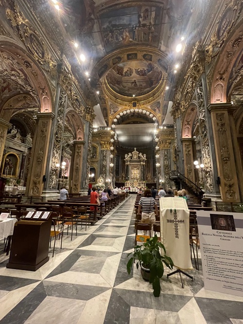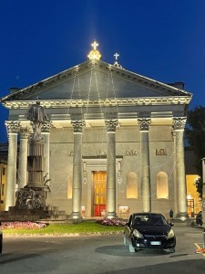 An die riesige Prunk Kirche davor ist ein Tempel ran gebaut mit riesigen römischen Säulen. aus der Kirche wird eine mächtige Kathedrale, sowohl außen wie auch innen. Es gibt sogar ein Konzert und wird gesungen.