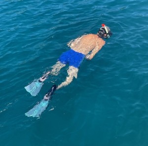 Ich mach meine 1. Schwimm Runde. Heute bedingt durch den Wind ist das Meer wärmer, also drinnen bleiben.