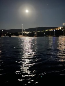 Der Wind aus West, der böse Mistral ist da. Alle Boote beginnen sich zu drehen. Es ist natürlich noch dunkel, aber es gibt viel Licht von den beiden Häfen und auch Straßen Beleuchtung überall.