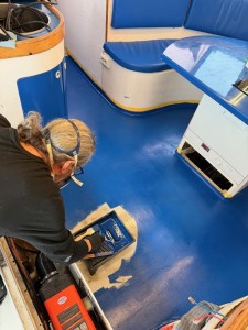 Kurt ist schon sehr gespannt, ob das Epoxid Harz gehärtet ist. Ich bin es noch viel mehr und schleich mich mal aufs Schiff, um zu greifen. Epoxid stinkt auch nicht so nach Lösungsmittel wie diese Polyester Farben. Ich greife vorsichtig und es ist Glas hart und Spiegel glatt. Sieht toll aus, wie ein Eislaufplatz, wie Wasser, dabei ist es hart und trocken.