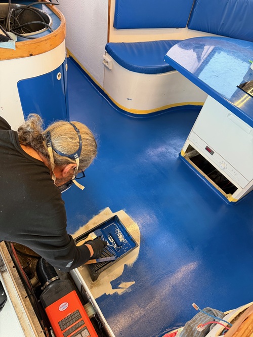 Er kommt schnell voran. Dann werden die beiden Standheizungen auf 30 Grad eingeheizt, damit es gut härtet und sich völlig mit dem Epoxid vermischt.