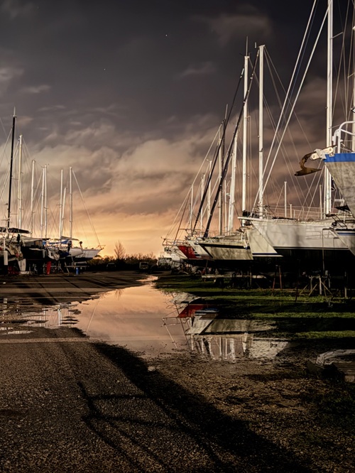 22.30 Wir sind endlich draußen, der Regen hat aufgehört. Für den Spaziergang benötigen wir heute wieder Gummistiefel. Der hintere Teil der Marina, der Älteste, hat gar keine Drainage gelegt und steht immer unter Wasser.