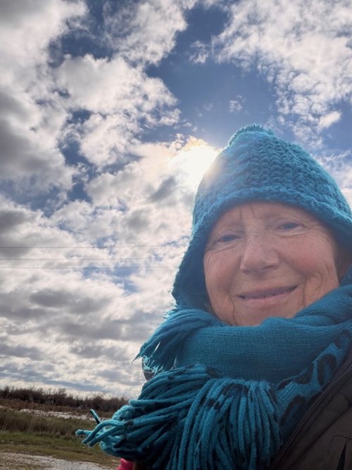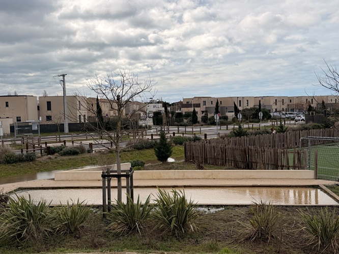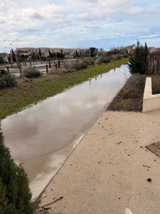 Rauf auf den Roller und voran geht es mit Seitenwind bis zur Energie Spirale. All die hübschen Boccia Flächen im Park, die angelegt wurden, sind jetzt kleine Pools. Ich denke, noch nie hat dieser Landstrich so viel Wasser bekommen.