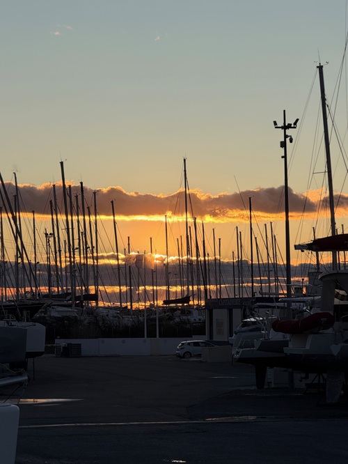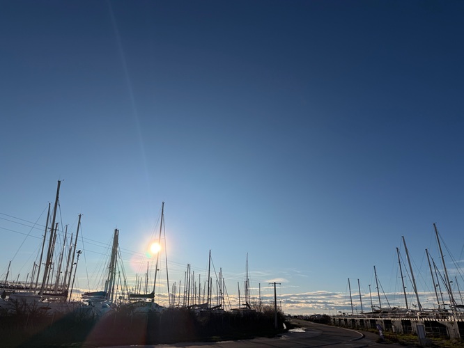 Wir machen eine Runde zum 2. Stellplatz, immer im Schutz der Boote, weil wir sonst nicht voran kommen. Zuviel Wind! wir stapfen, als würden wir bergauf gehen. Das kann nur der trockene Mistral, die Wolken vernichten. Dafür haben wir eben starken Wind. Man kann nicht alles haben.
